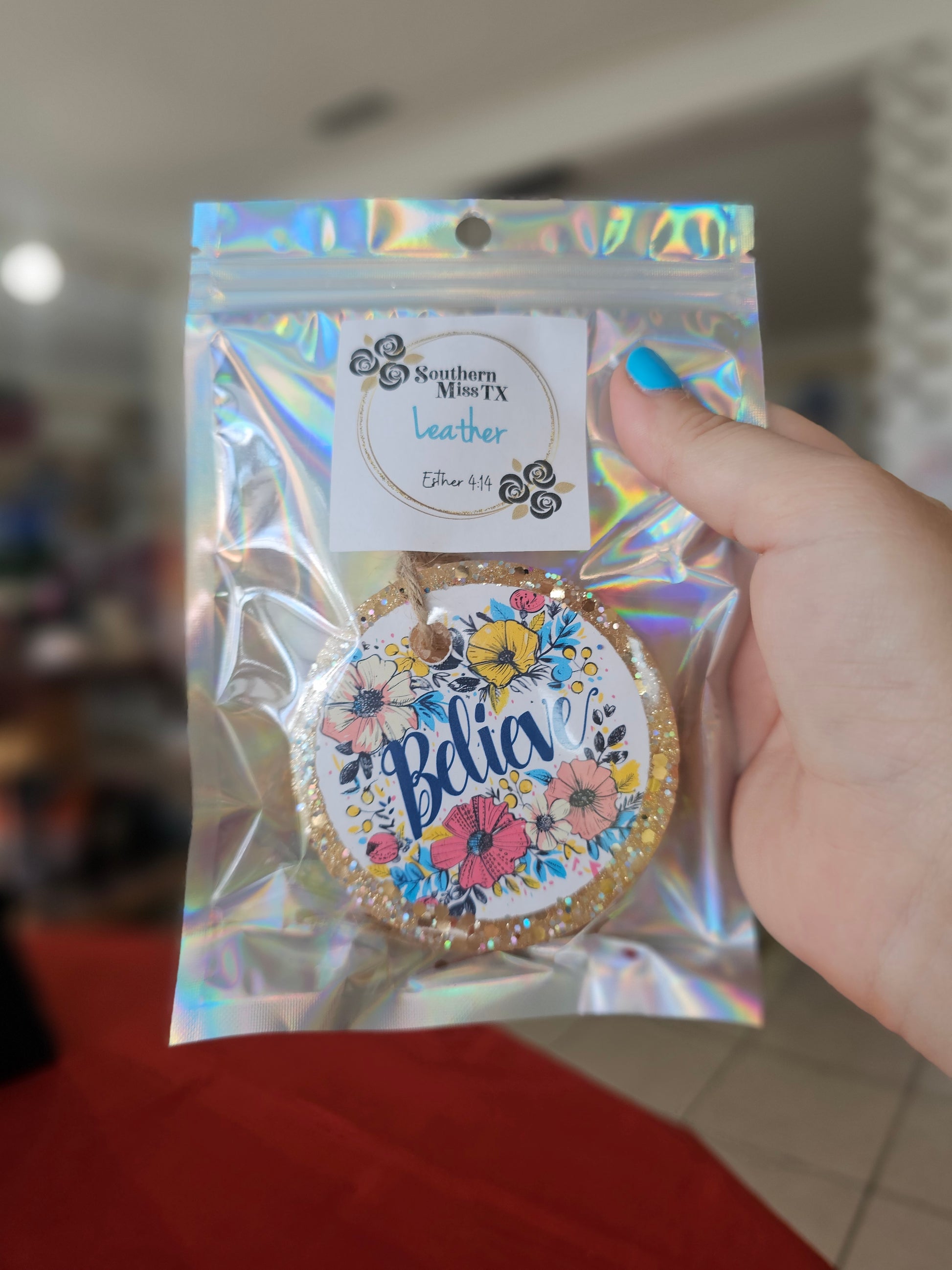 Add a little joy to your journey with our hand-poured car freshies! Each one is long-lasting, beautifully scented, and cute enough to hang anywhere — from your rearview mirror to your closet. Perfect for gifting or treating yourself to a fresh-smelling ride!