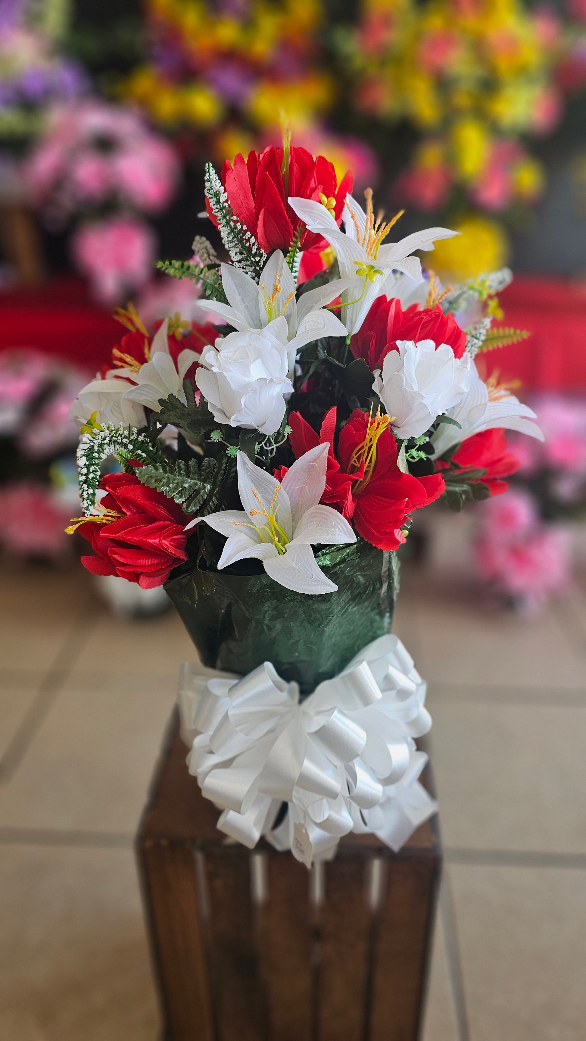 Graceful lilies and bold red blooms come together in this arrangement, full of reverence and quiet hope. It’s a gentle reminder that in Christ, we are held, loved, and never forgotten.