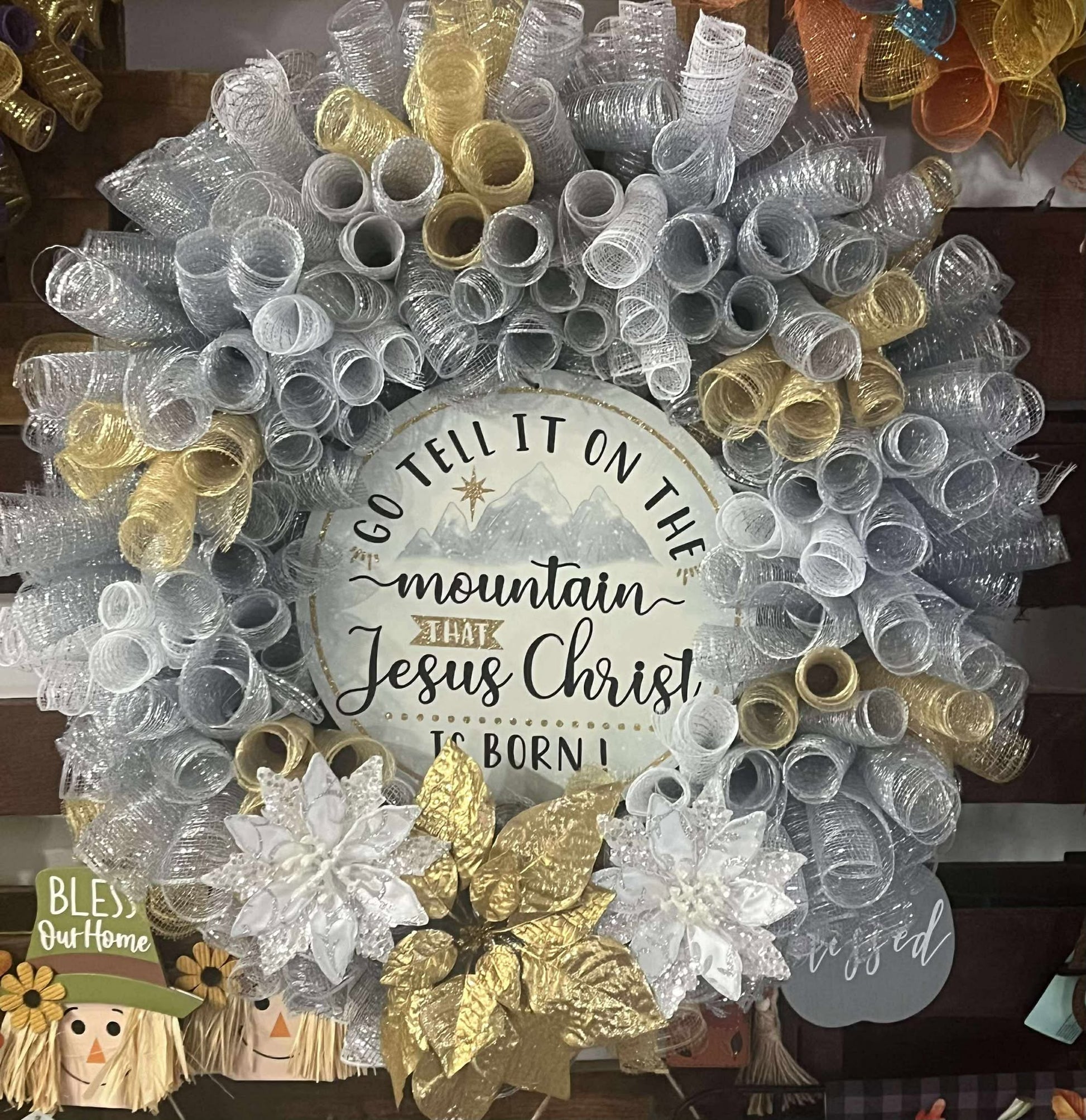 “Go tell it on the mountain that Jesus Christ is born!” This breathtaking wreath features layers of shimmering silver and soft gold mesh, crowned with metallic poinsettias that reflect the light just right. It's a regal and reverent reminder of the reason we celebrate.