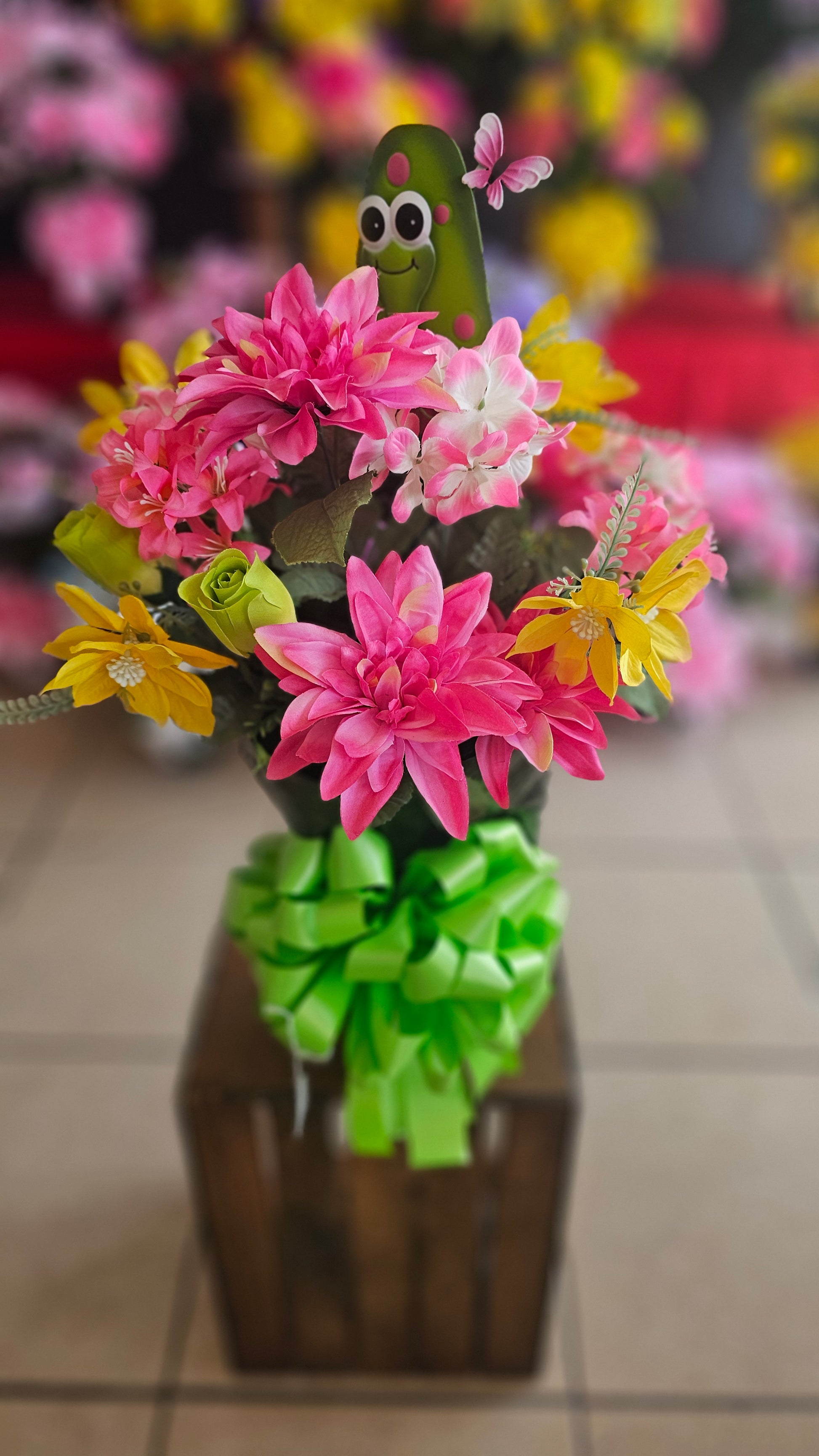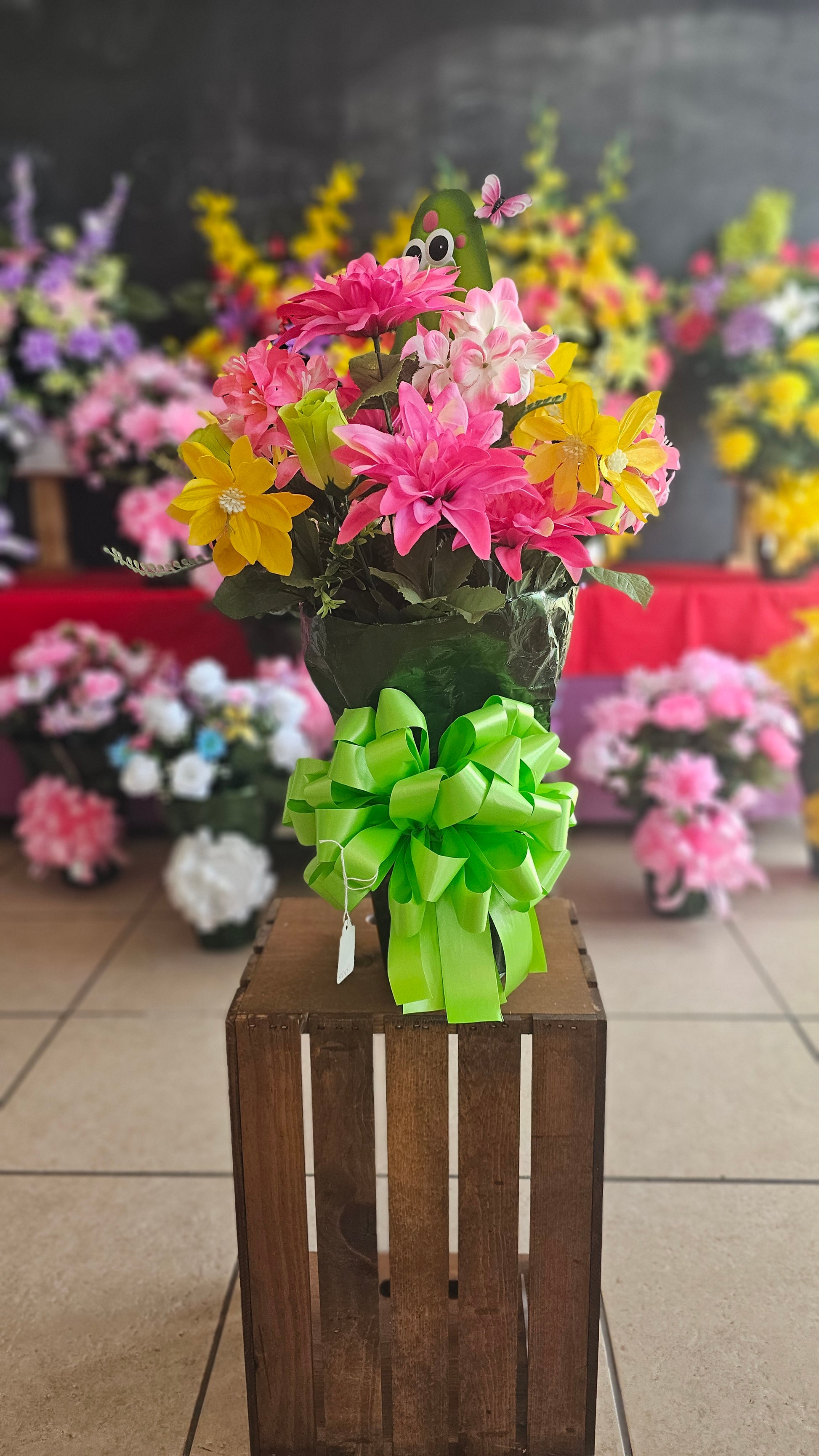 This soft and cheerful arrangement is full of grace and quiet strength—just like the gentle spirit it’s meant to honor. With pink and yellow blooms, a light green bow, and a sweet turtle nestled in the flowers, it’s a beautiful symbol of steady love, peace, and the promise of eternity.