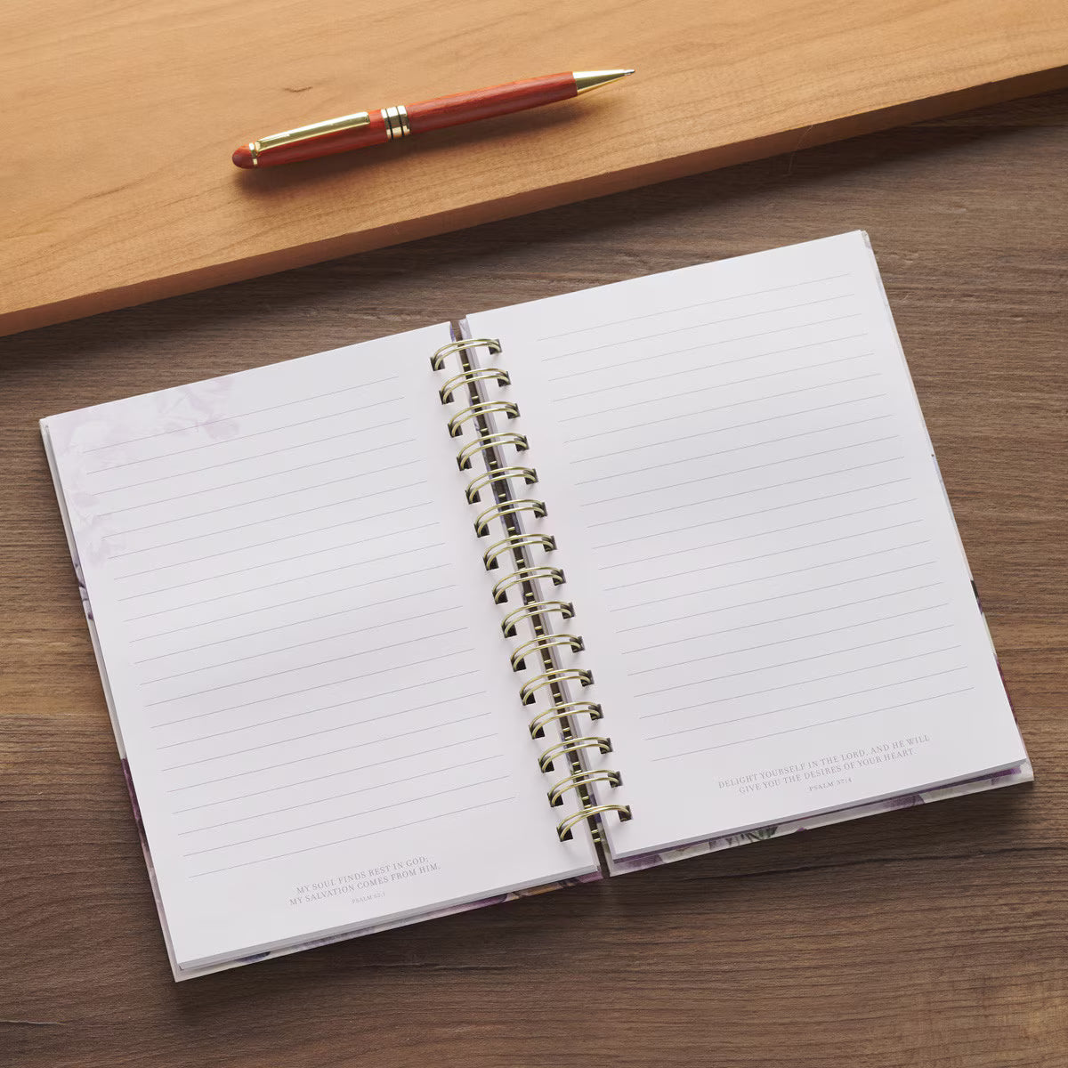 The journal has 192 pages. Each page is lined and features a Scripture verse at the bottom. These verses can be used as Scripture memory verses, journals, or prayer prompts. There is a presentation page where you can add a message when you decide to give this journal as a gift. The journal is bound in durable gold o-wire. Each page spread is adorned with a subtle purple floral design in the top left corner.